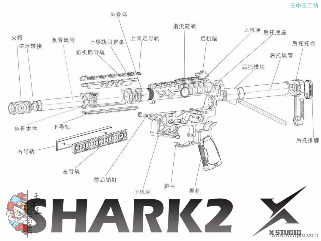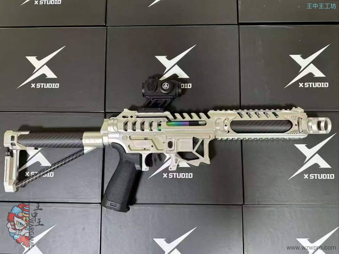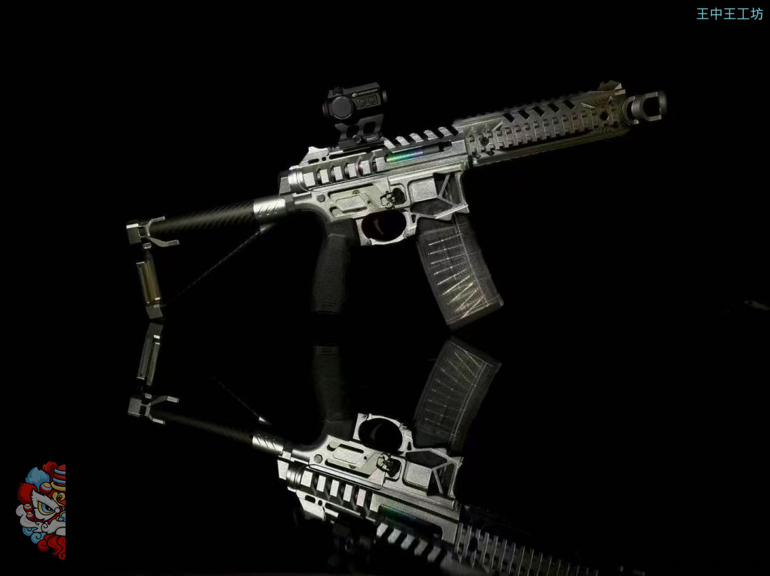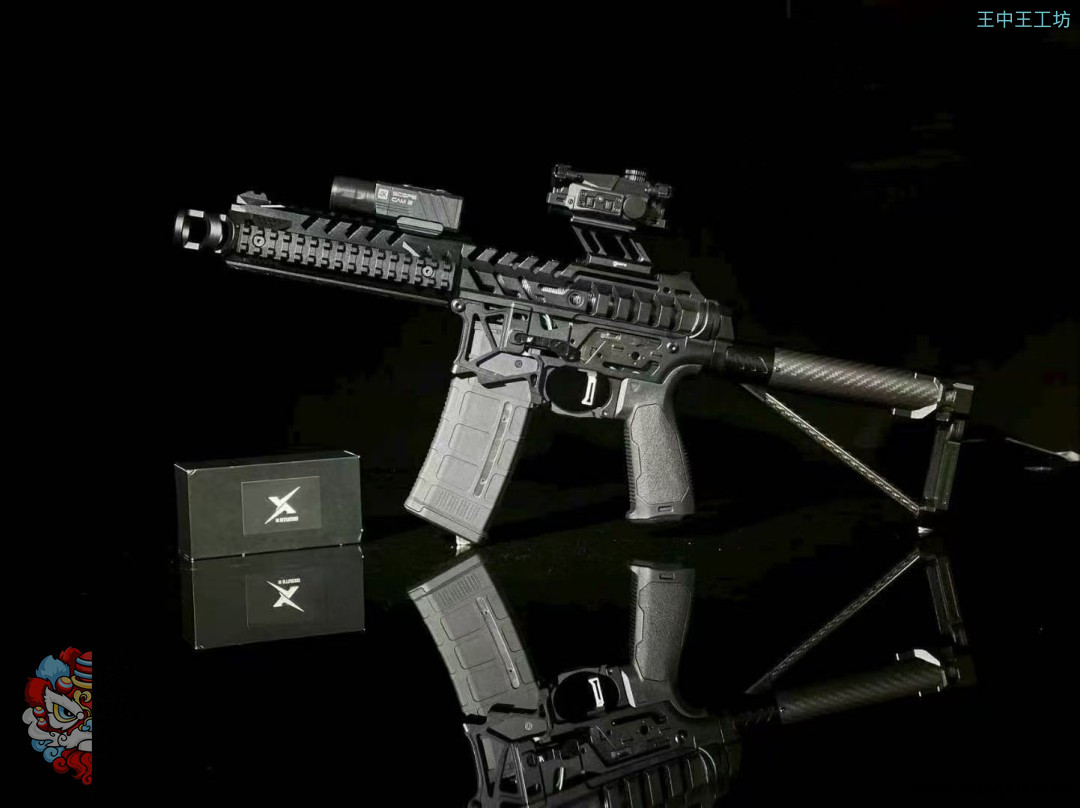 • 套件配件:配备火冒、鱼骨、碳纤维外管、定制四面导轨(定制前机瞄导轨+定制左右下导轨)、后机瞄、上下机匣、陀螺、专属销钉、快慢机、弹匣卡榫、si 握把、护弓、后托、推牌电池后盖等众多配件。