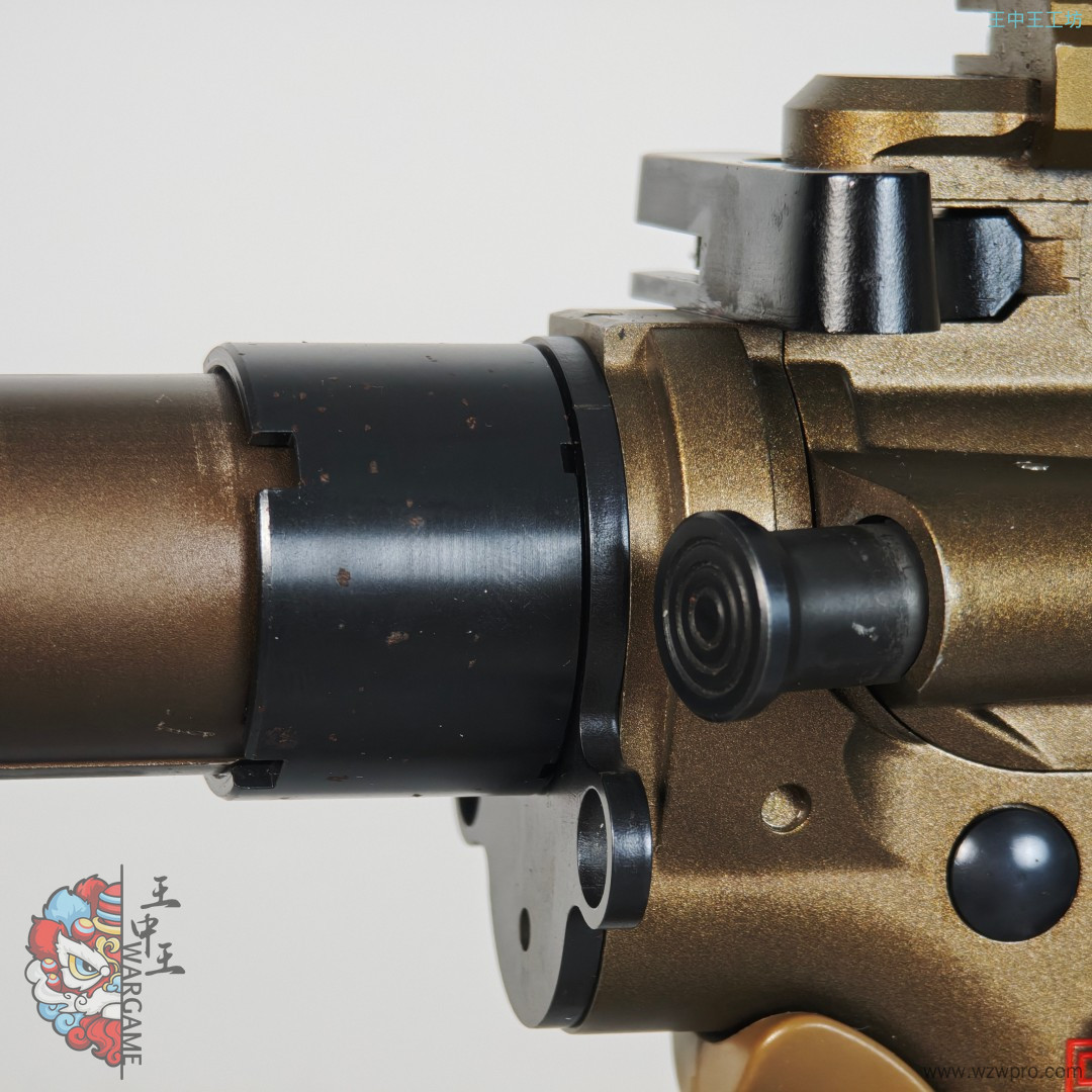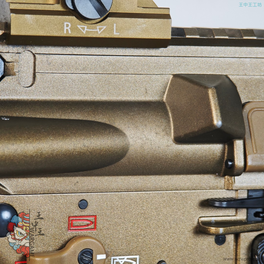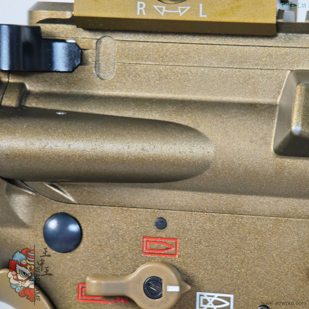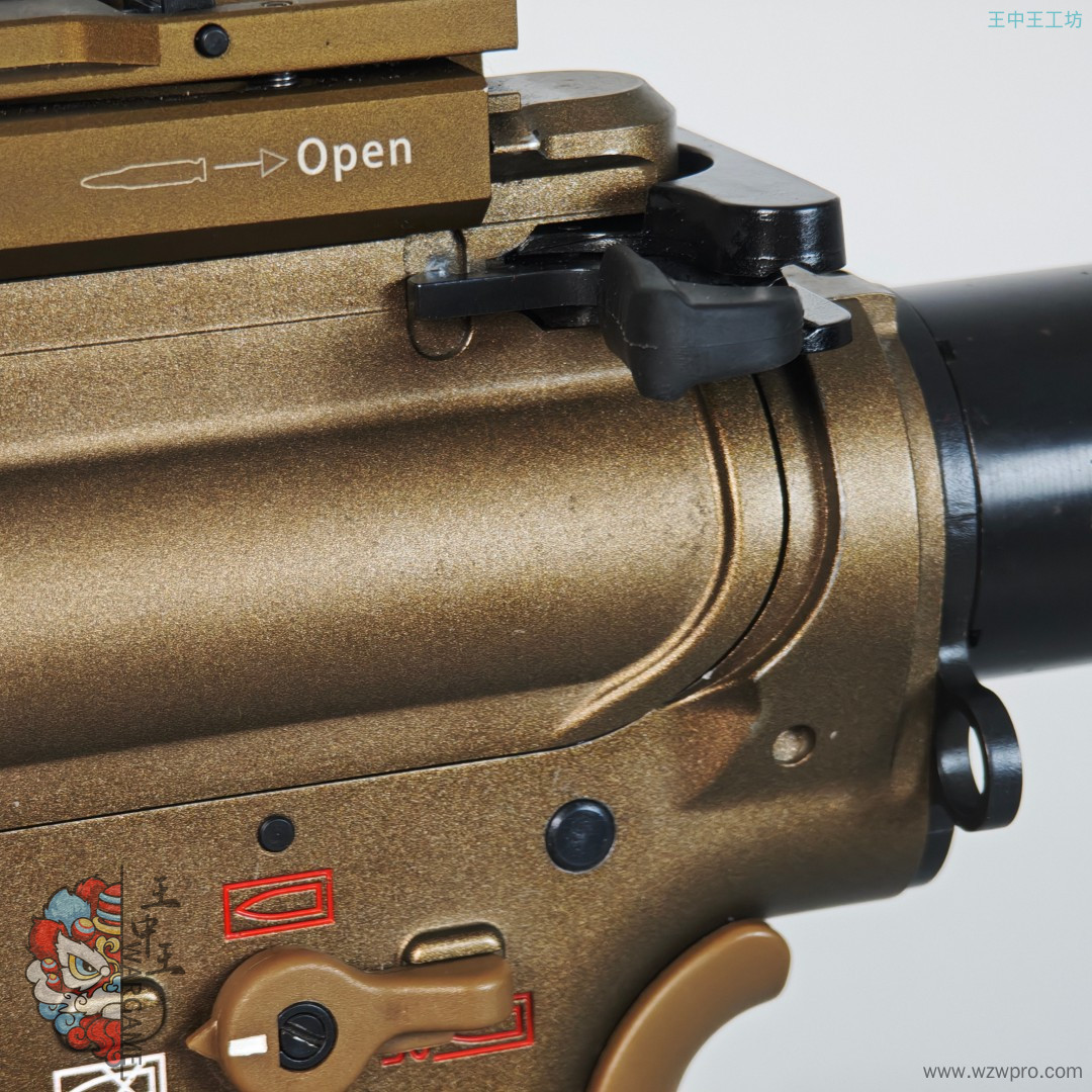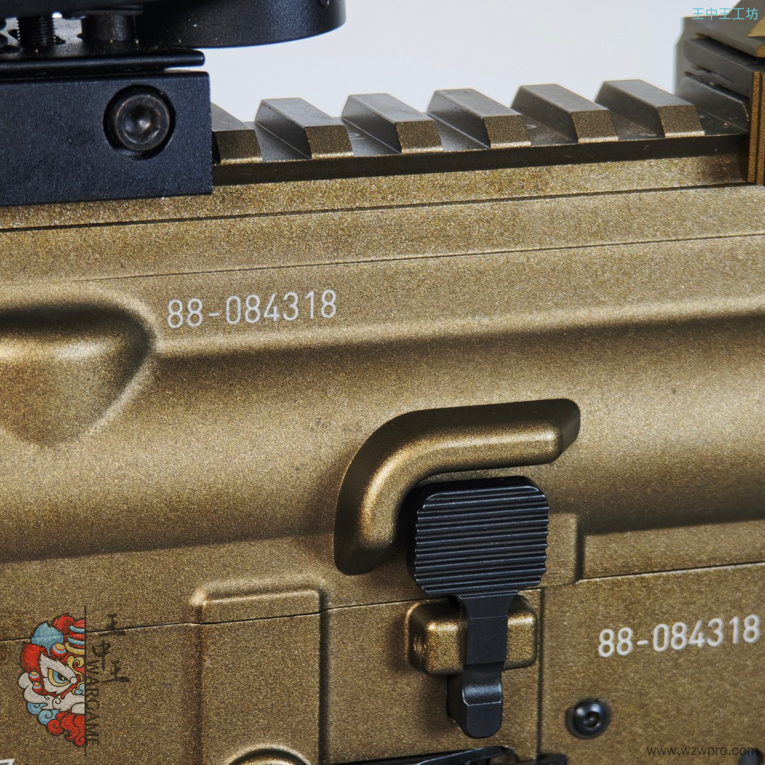 整体没有划痕,但很可惜的是上下机匣的漆面有像腐蚀一样的痕迹,不是很重,照片都不太好拍出来,鱼骨没有任何问题,具体请看下图,整体非常板正。双边弹匣释放少个补件,只能使用单边。