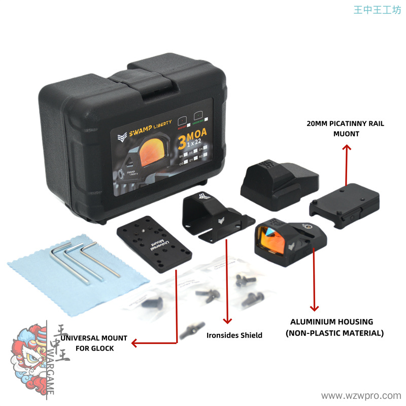 外观独特,使用轻便的小红点,少有两种准心选择可选红点绿点,采用铝合金材料,功能全面强大且丰富,使用场景广泛! 6063主体铝合金材质,带有专用骨骼保护罩,7档白光调节,3档 低能耗 LED夜视档,多层镀膜使得成像更清晰,配件齐全适配20mm导轨以及带有GLOCK底板!