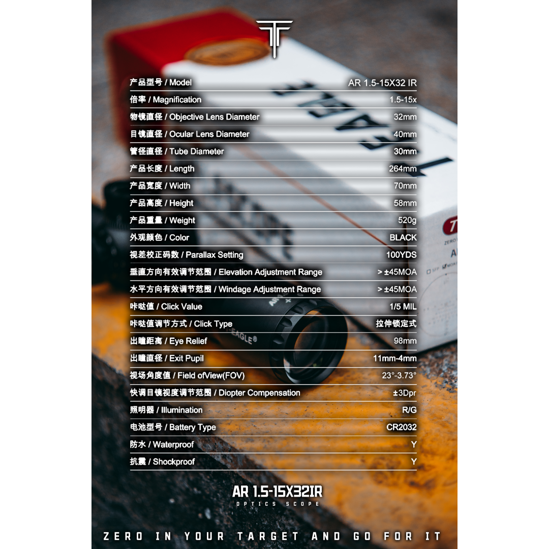 T-EAGLE/突鹰 高端系列短瞄🔥 -AR1.5-15X32IR海外高定款- 10倍比光路系统顶级短瞄,分划板后置, FMC多色宽带绿膜;风偏数字分化线,1.5-15倍远近通吃,ESF侧调焦配备大手轮(可拆卸),拉伸锁定调节 ,30管径一体管,长度仅26.5CM 短小强悍 ,性能拉满!