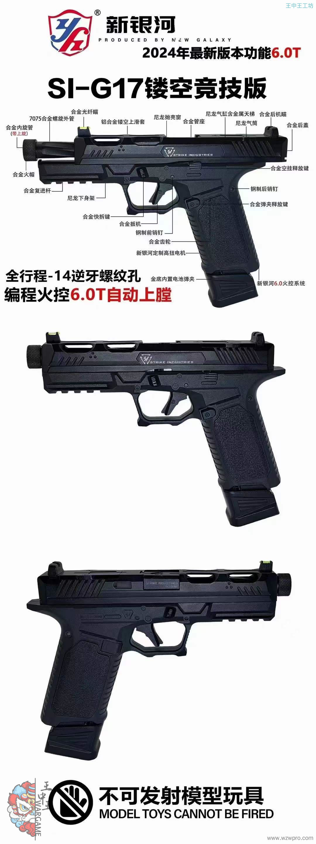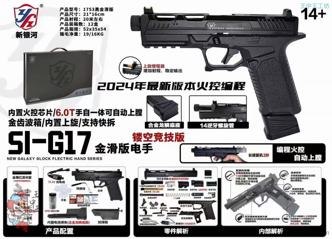 合金配置: 合金裸滑套 金外管 金内管 新银河专用旋 金天梯 金管座 尼龙抛壳窗 金复进杆 金属弹簧尾盖 1.1主力簧 ( 全身 可1-1复刻 快拆)