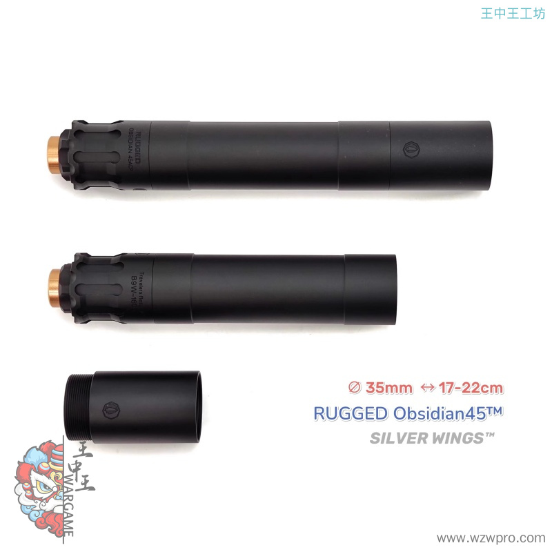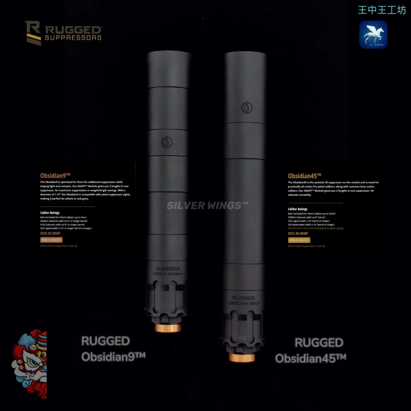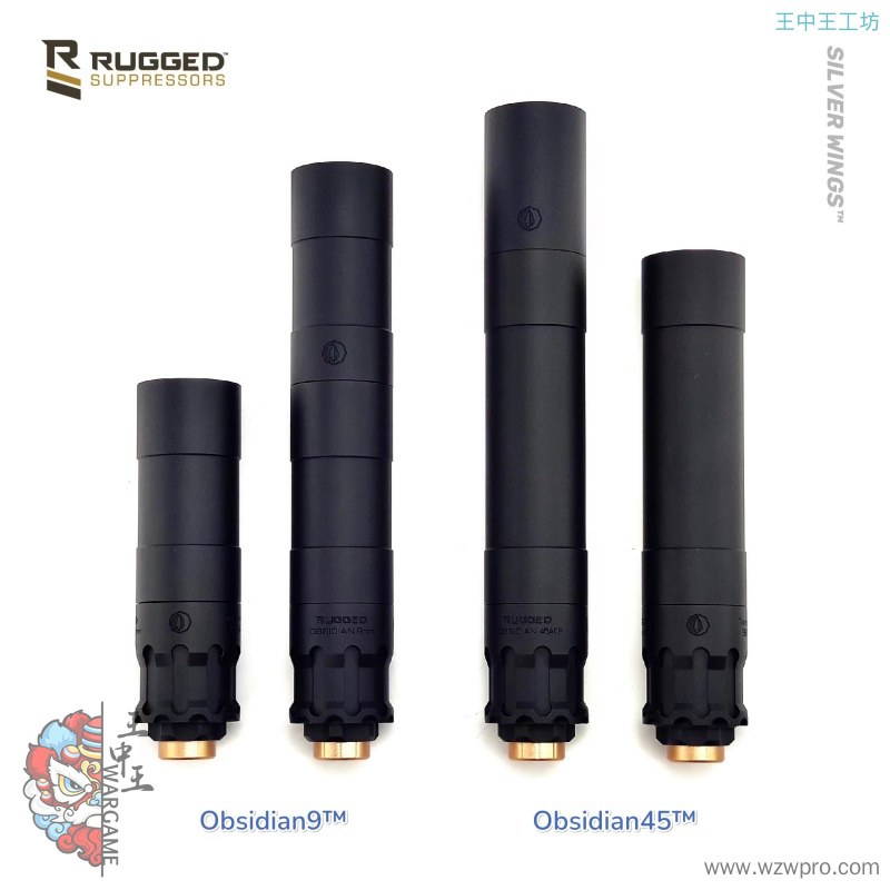 RUGGED公司是美国专业的高端消音器制造商之一。旗下的两款Pistol Suppressor,Obsidian .45/9mm 被广泛搭载于各种高端定制手枪、冲锋枪和轻型AR步枪上。其独特的ADAPT模块化设计可以拆掉中间一节使其在长短消音之间自由组合切换。